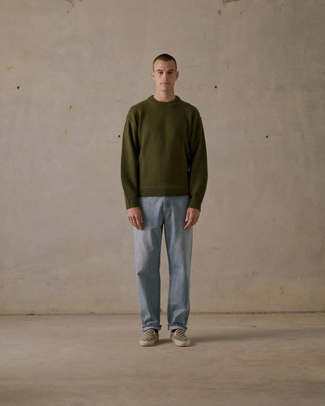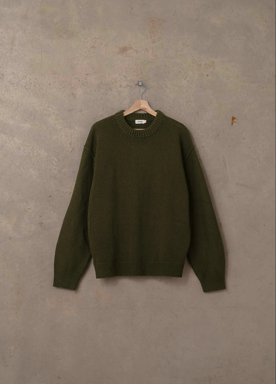A new style in our Knit quiver, the Reverse Seam is made of a luxiouriously soft 100% Australian Merino wool. It features a slightly dropped shoulders and overall boxier fit in two go-with-anything-colours; Dark Tan and Green.