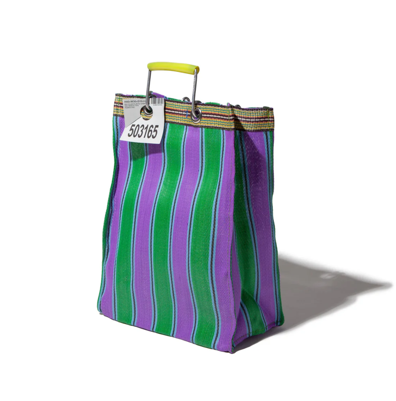 This Recycled Plastic Stripe Bag is designed for everyday carrying, crafted from vibrant recycled plastic in a range of sizes and colours. Each piece has subtle variations in tone and weave, a natural result of the recycled materials used.